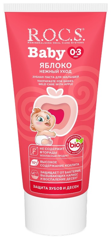 Уникальная зубная паста** предназначена для ухода за зубами малышей, начиная с самого раннего возраста. Ароматизатор, изготовленный на основе натуральных компонентов придает зубной пасте нежный вкус натурального яблочного пюре, который доставит удовольствие вашему малышу. БЕЗОПАСНА ПРИ ПРОГЛАТЫВАНИИ! Не содержит фтор, отдушки, красители, лаурилсульфат натрия и парабены. **Формула зубной пасты защищена патентами *Подтверждено лабораторными и клиническими исследованиями.