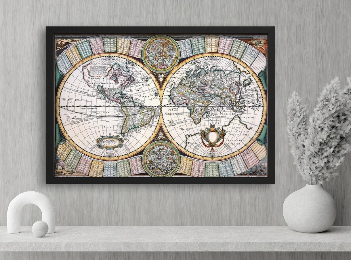 Детализированная карта мира XVIII века с декоративным календарём и астрономическими элементами. Яркий и познавательный акцент для классических интерьеров, оформлена в строгую чёрную раму.