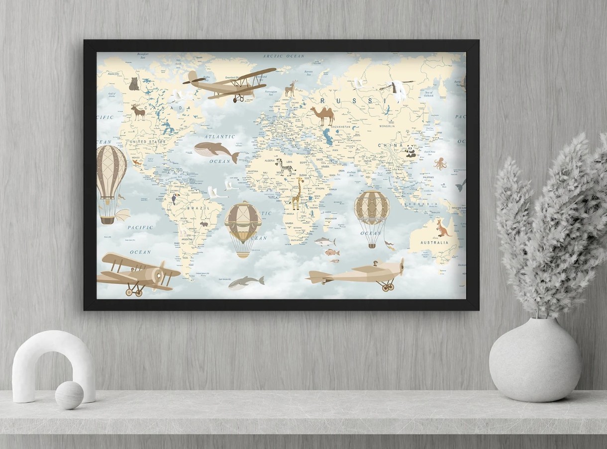 Картина на холсте с детской картой мира в нежных тонах: воздушные шары, животные, птицы и самолёты. Идеален для оформления детской комнаты и развития интереса к географии.