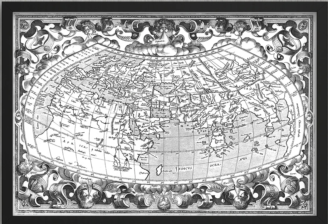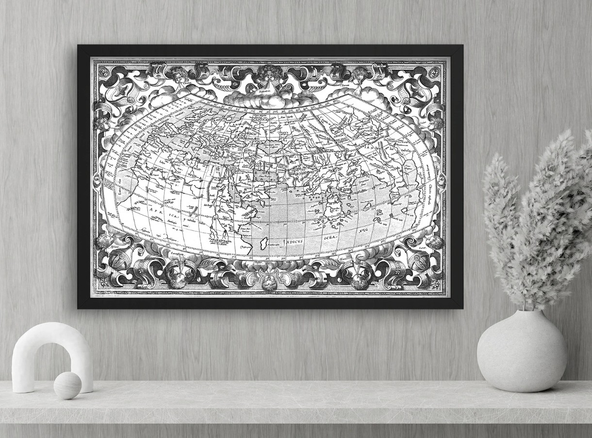 Впечатляющая чёрно-белая антикварная карта мира в раме — идеальный выбор для интерьеров в классическом или винтажном стиле. Эта картина не только украсит пространство, но и подчеркнёт вкус к истории и элегантности.