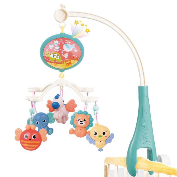 На нем подвешены 5 игрушек, изображающие разных веселых персонажей. Мелодичные песенки и завораживающее движения игрушек-подвесок позабавят малыша. Игрушки можно снять и дать в ручки. Они послужат отличным предметом для развития моторики рук. Ребенок будет ловить яркие игрушки, развивая двигательную активность и внимание.