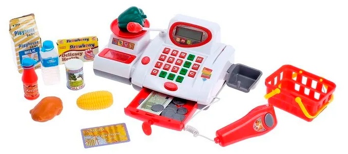 Бытовая техника оснащена настоящим калькулятором, слотом для карт и сканером. Кроме того, в комплект входит кредитная карта, корзина для покупок с деньгами и набор продуктов. Бытовой прибор питается от 3-х батареек типа АА (1,5 В), которые не входят в комплект поставки.