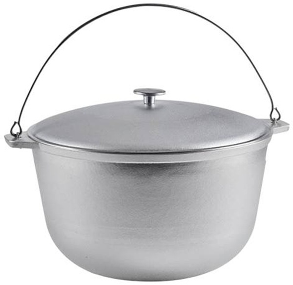 Казан полевой армейский объёмом 24 литра (стандарт 25 ± 1 л, артикул D1124) изготовлен из цельнолитого пищевого алюминия толщиной 3 мм. Диаметр казана составляет 400 мм, корпус прочный и оснащён усиленными дужками для удобного переноски и подвешивания. Эта модель предназначена для приготовления пищи на открытом огне или полевых кухнях, полностью соответствует требованиям армейских кухонь (КП‑2‑48, КП‑130 и аналогов) и рассчитана на питание групп 15–25 человек. Казан легко моется вручную, выдерживает температуры от –40 °C до +300 °C и идеально подходит для армейского использования, гуманитарных миссий, спасательных служб и туристических лагерей.
