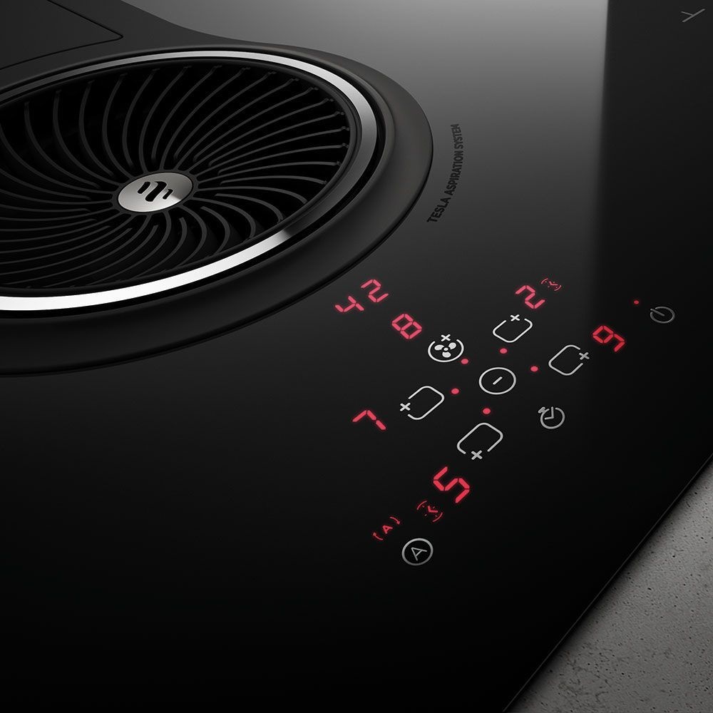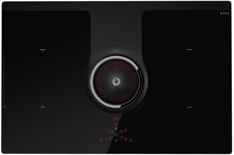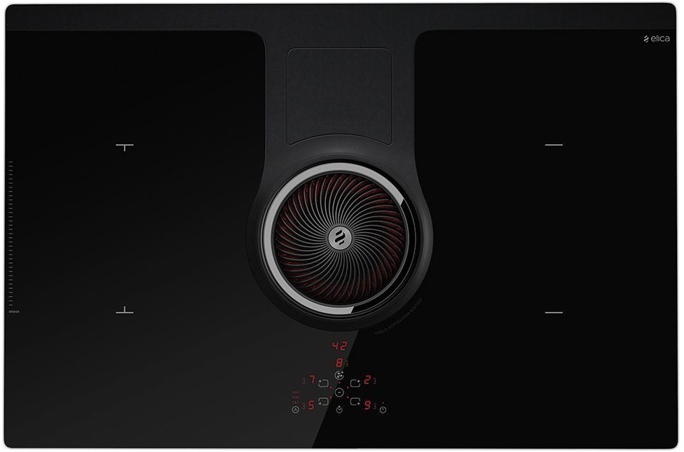 Дизайн. Революционная модель ELICA NIKOLATESLA BL/F/83 — индукционная варочная панель на 4 конфорки со встроенной мощной вытяжкой. Черная стеклокерамическая модель с фронтальной стороны дополнена панелью управления обоими устройствами.