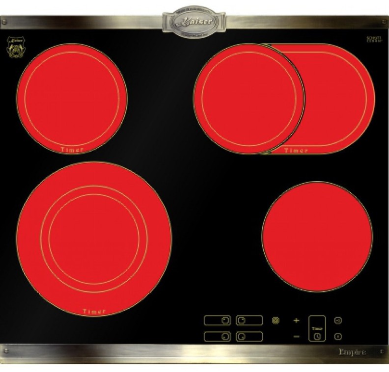 Независимая варочная поверхность Kaiser KCT 6385 Em из линейки Empire цвета антрацит выполнена из ударопрочной керамики. Украшение износостойкой графикой и твердыми бронзовыми пластинами придает панели индивидуальность. Поверхность оснащена четырьмя конфорками HiLight, одна из которых имеет двойную, а другая — овальную зону расширения.