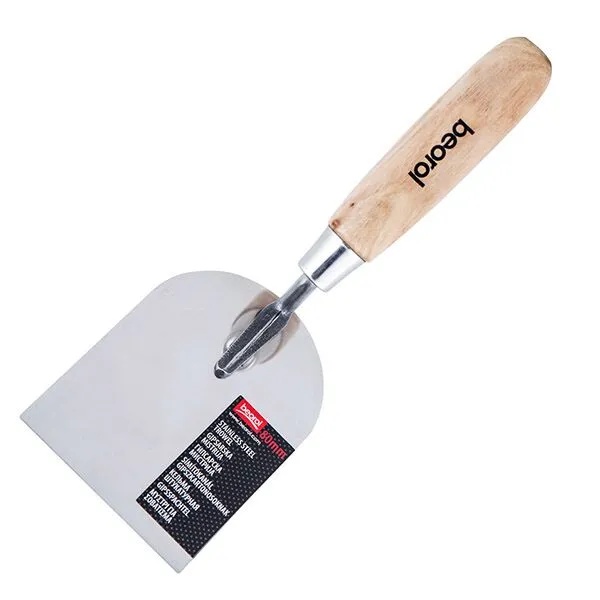 Кельма с деревянной ручкой сделана из нержавеющей стали. Ширина кельми 80мм Форма и размеры кельмы подходят для выполнения работ на небольших поверхностях
