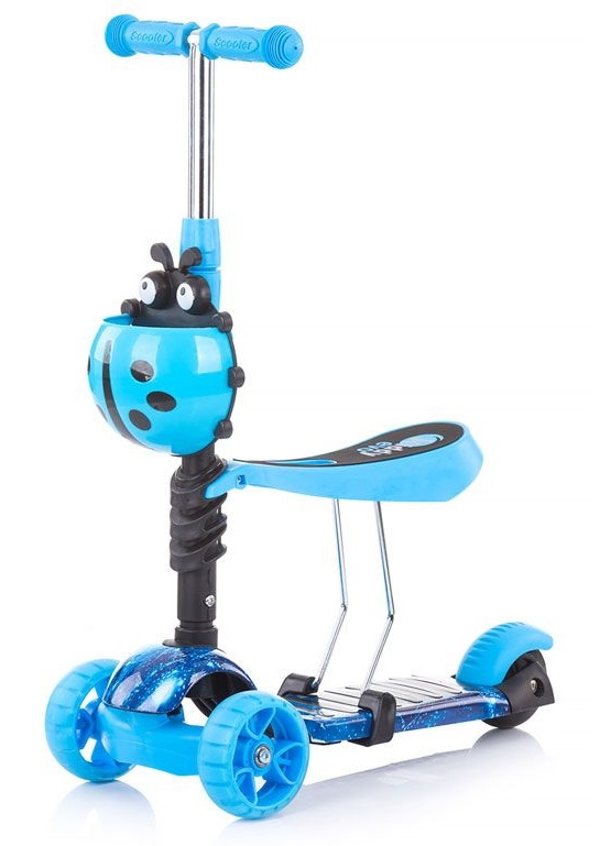 Сиденье самоката регулируется по высоте в 3 положениях — от 22 до 29 см. Руль регулируется по высоте в 3-х положениях. Резиновые ручки с противоскользящим покрытием. Тормоз на заднем колесе. У скутера спереди есть корзина для хранения аксессуаров.