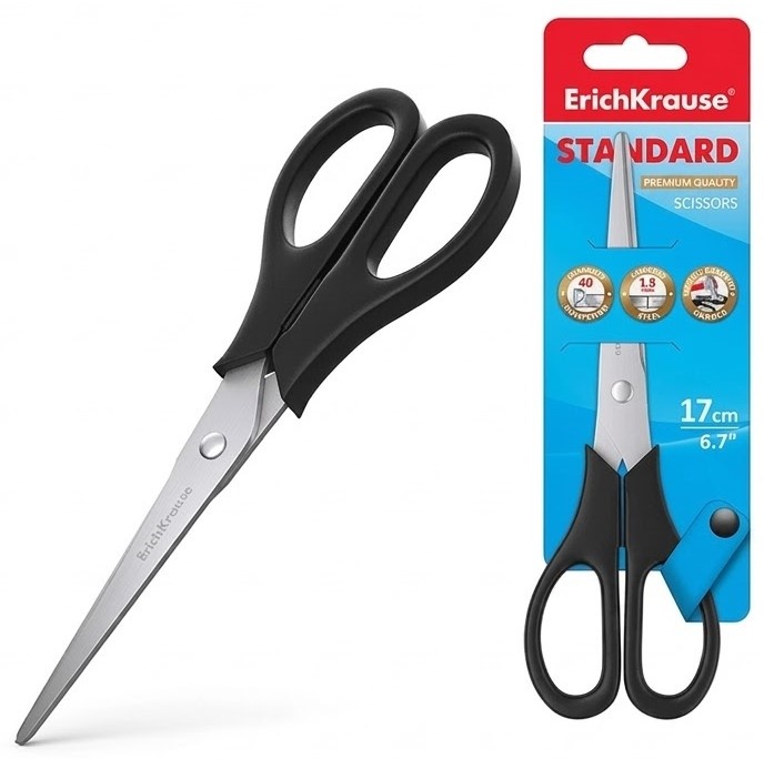 Ножницы ErichKrause длиной 17 см, черного цвета, — отличный выбор для левшей, которым нужны удобные и надежные ножницы.