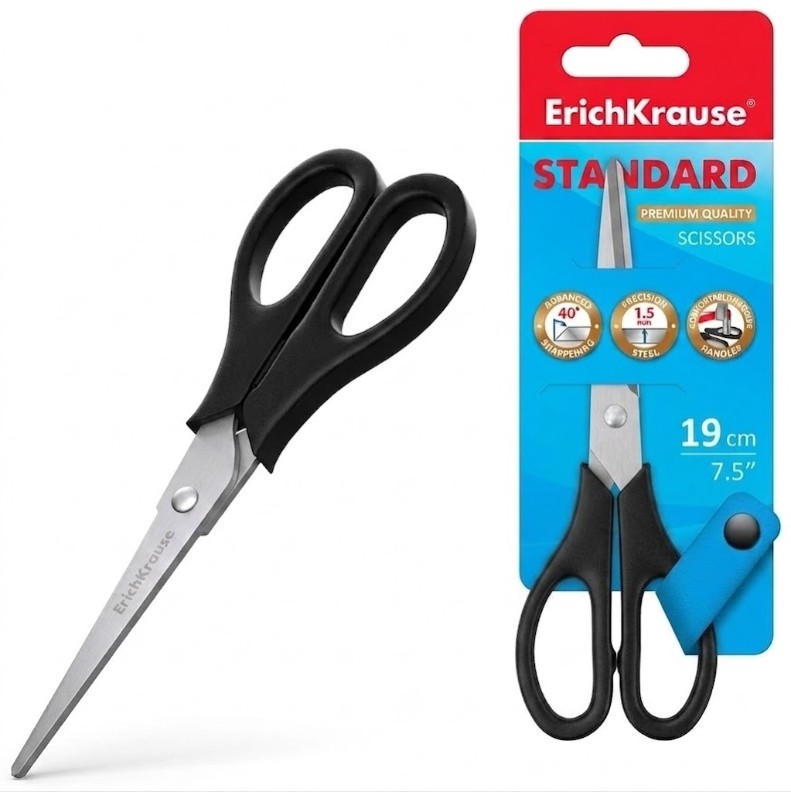 Ножницы ErichKrause длиной 19 см, черного цвета, — отличный выбор для левшей, которым нужны удобные и надежные ножницы.