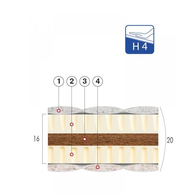 Конструкция матраса – прекрасное сочетание характеристик современных материалов: эластичности латекса и жесткости кокосовой койры. Вспененная структура высококачественного латекса обеспечивает прекрасную воздухопроницаемость и гигиеничность матраса. Матрас обладает безупречными анатомическими характеристиками. Стеганый чехол выполнен с использованием волокон шерсти и хлопка для создания эффекта «Зима-Лето».