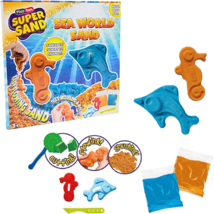 В комплект входят синий и оранжевый песок, а также формочки для создания дельфинов, морских коньков и других морских обитателей — идеально для воображаемой игры.