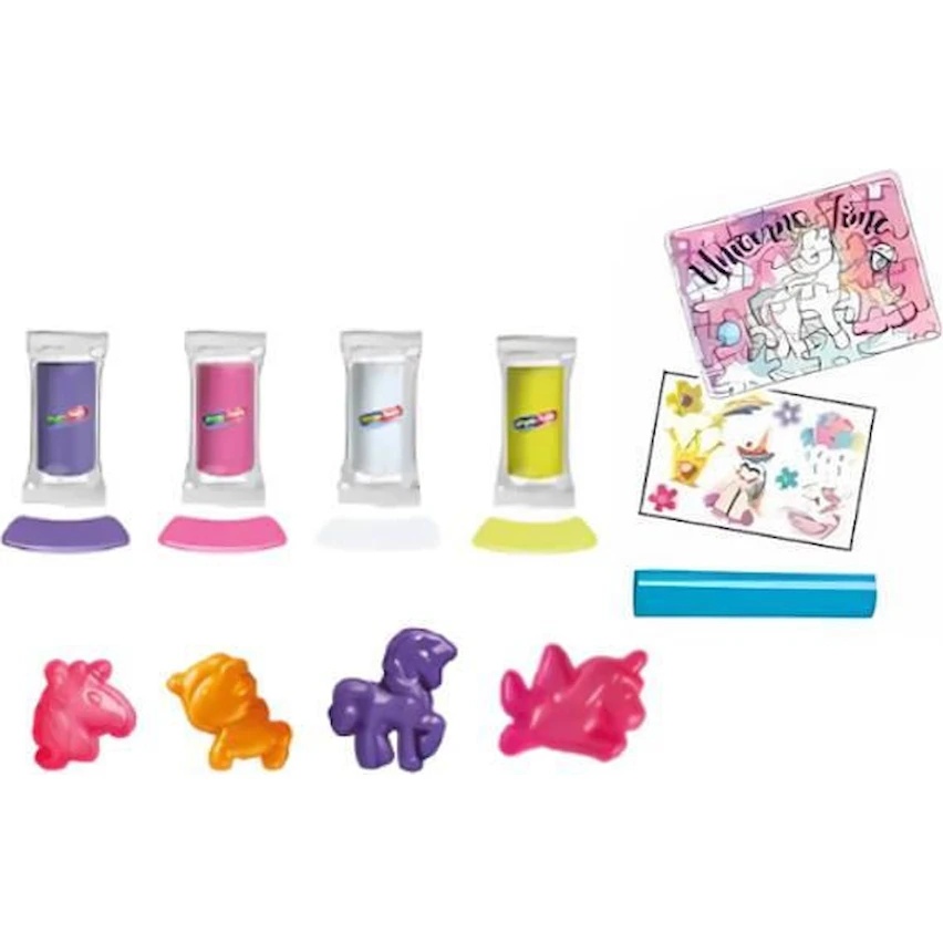 Набор включает 4 цвета пластилина по 15 г каждый. В комплект входят 5 формочек с тематикой единорогов, которые помогут создать удивительные фигурки, а также пазл и наклейки.