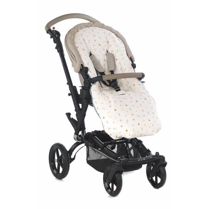 Он имеет специальную форму сзади, регулируемую по высоте, чтобы избежать трения о колеса коляски. Изготовлен из 100% хлопка, дышащего материала, и внутренний наполнитель полностью съемный. Он также оснащен ремнями для поддержки и крепления к креслу коляски.