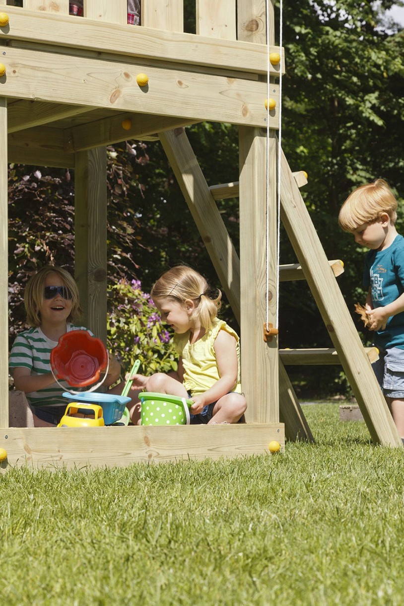 Базовая комплектация: Игровой домик (высота платформы 120 см), лестница с деревянными ступенями , песочница, Горка-скат с установочной высотой 120 см, модуль для подвесов качелей (качель Blowmoulded и качель DeLux )