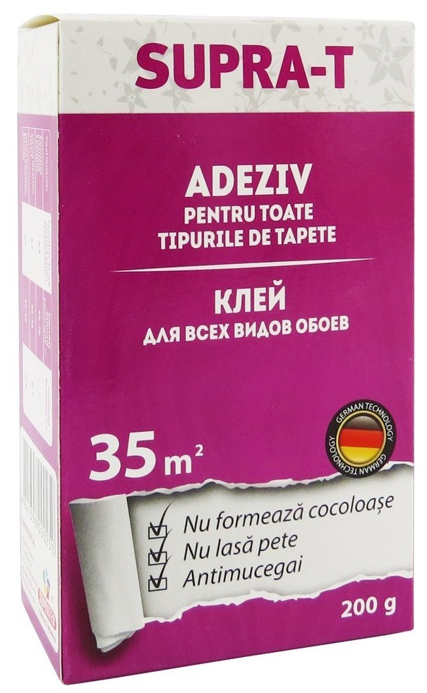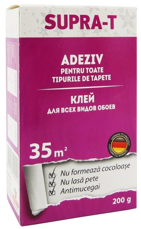 SUPRA-T предназначен для приклеивания всех видов обоев на бетонные, отштукатуренные, деревянные поверхности, гипсокартонный лист, а также для предварительной обработки оклеиваемой поверхности.