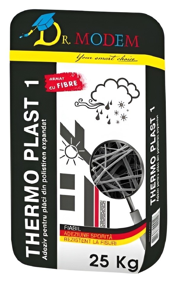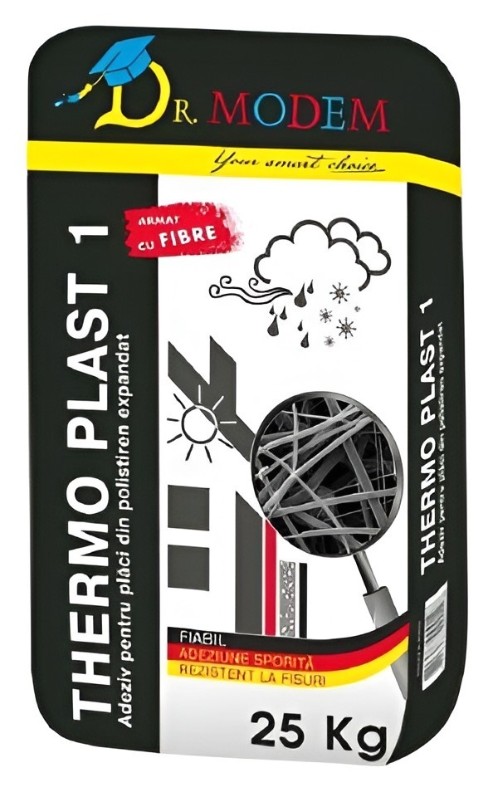 Thermo Plast 1 - армированный фиброй полимерцементный клей для крепления теплоизоляционных плит. Обеспечивает высокую адгезию к основанию, а также эластичность. Клей обладает отличной трещиностойкостью, паропроницаемостью и прочностью.