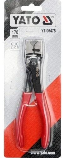 Профессиональные зажимные клещи типа Clic и Clic-R YATO YT-06475. Применяются для демонтажа многоразовых кабельных стяжек на резиновых шлангах автомобилей марок VW, AUDI, CITROEN, FIAT, MERCEDES, OPEL, PEUGEOT, RENAULT. Челюсти изготовлены ковкой, а затем отшлифованы. Это дает им очень прочную структуру. Для удобства использования была использована разжимная пружина, а рукоятки покрыты ПВХ-оболочкой.
