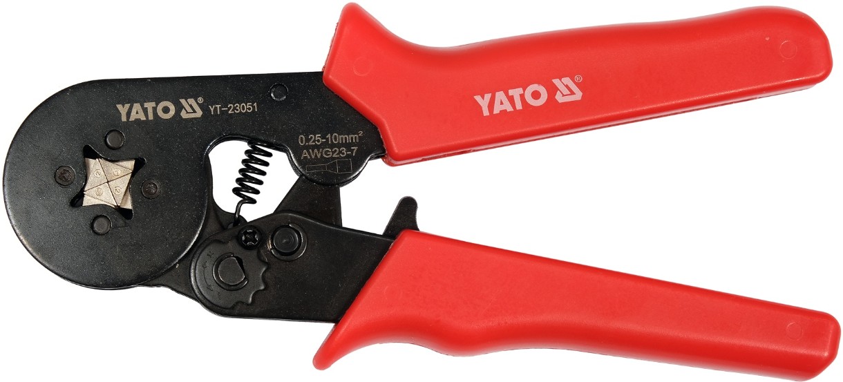 Клещи с храповым механизмом YT-23051 для опрессовки гильзовых разъемов. Плоскогубцы изготовлены из углеродистой стали, подвергнутой процессу окисления, что защищает от коррозии. Зажим из четырех частей изготовлен из высокопрочной хромованадиевой стали.
