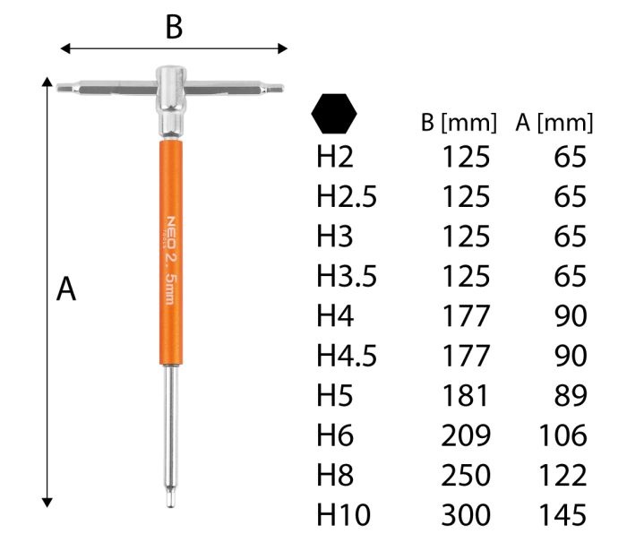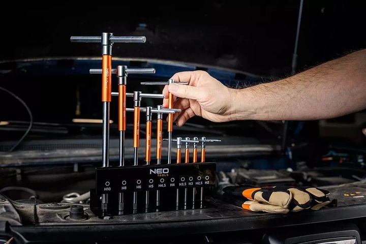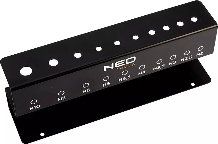 Гаечные ключи HEX. Набор из 10 штук в подставке 2 - 10 мм 09-509 от NEO TOOLS - это набор, состоящий из гаечных ключей HEX (шестигранных) 10 различных размеров и практичной подвесной подставки размером 220 x 40 x 82 мм (расстояние между отверстиями для подвешивания - 175 мм). Гаечные ключи изготовлены из прочного металлического сплава CRV. Они предлагаются в размерах: H2 (125 x 65 мм), H2,5 (125 x 65 мм), H3 (125 x 65 мм), H3,5 (125 x 65 мм), H4 (177 x 90 мм), H4,5 (177 x 90 мм), H5 (181 x 89 мм), H6 (209 x 106 мм), H8,(250 x 122 мм), H10 (300 x 145 мм). Благодаря своей длине и разнообразию они обеспечивают доступ к более глубоким винтам. Набор NEO TOOLS также предлагает два варианта использования: более длинная часть может использоваться как набалдашник, а шплинт имеет наконечники типа HEX выбранного размера. Гаечные ключи пригодятся везде, где используются гаечные ключи типа HEX (Allen), например, для откручивания винтов, регулировки, например, в мастерских по ремонту велосипедов или при монтажных работах. Благодаря входящему в комплект стеллажу их легко хранить в порядке и под рукой.