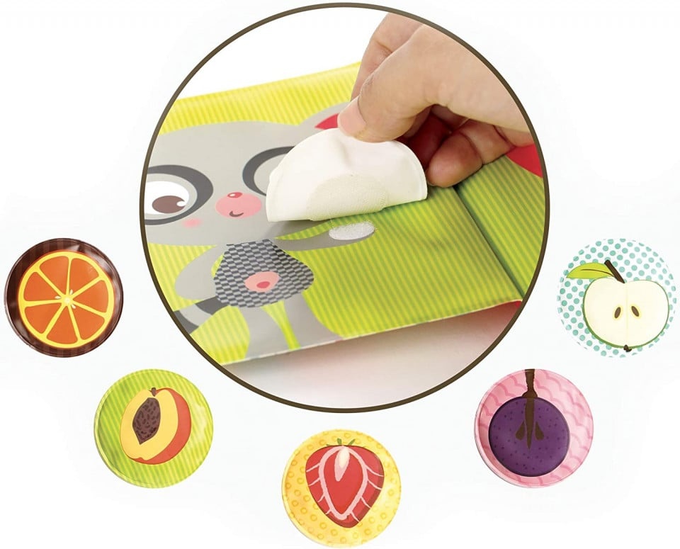 Отличный способ научиться говорить, не теряя времени! Первые детские книги развивают внимание, воображение и словарный запас. Они предлагают отличный способ создать моменты близости между детьми и их родителями. Всегда есть возможность почитать и открыть для себя что-то новое! Оригинальный, сенсорный и фруктовый подход! Забавные животные представляют свои любимые фрукты. Сюрприз: от них исходит восхитительный аромат! Детям понравится открывать их и по очереди находить свои любимые фрукты. Прекрасная возможность потренировать память и распознавать фруктовые ароматы. С каждым чтением дети развивают свою речь и словарный запас. Столько всего можно узнать! Запахи, названия животных, цвета и т. д. Книга, и не только. А ещё игра «Найди пару»! К книге прилагаются пять маленьких наклеек, изображающих дольки фруктов. Проводя по ним пальцем, ребёнок узнает запах, который ему нужно будет связать с изображенным фруктом. Затем он может поместить точку в нужное место с помощью липучки. Персик, апельсин, клубника, яблоко и виноград больше не будут для детей секретами! После игры всё, что нужно сделать, — это сложить всё в специальный кармашек в конце книги. Эта удивительная маленькая книга сопровождает детей в их познании окружающего мира. Игривая, она позволяет им увидеть новое измерение в понимании увиденного. Сочетание запаха с изображением стимулирует обонятельную память и облегчает обучение. Книга с нежными иллюстрациями, страницы и зарисовки которой понравятся маленьким ручкам. Можно стирать влажной тканью.