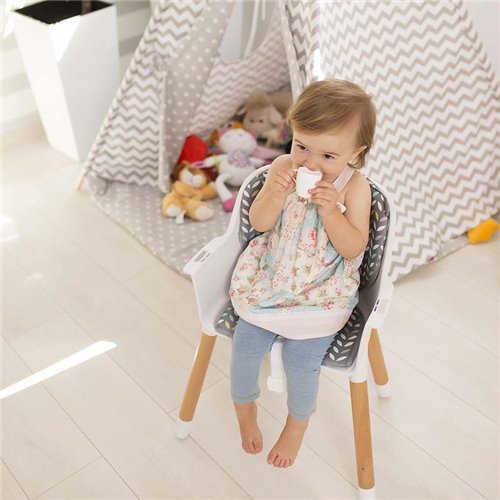 Высокий стул спроектирован на основе скандинавского дизайна. Стул растет вместе с ребенком. Высокий стул для кормления благодаря двухуровневой регуляции высоты трансформируется в обычный стул для более взрослых детей. 5-точечные ремни безопасности обеспечивают безопасность для ребенка, а съемная обивка ткани LikeaSkinочень легко поддается очистке.