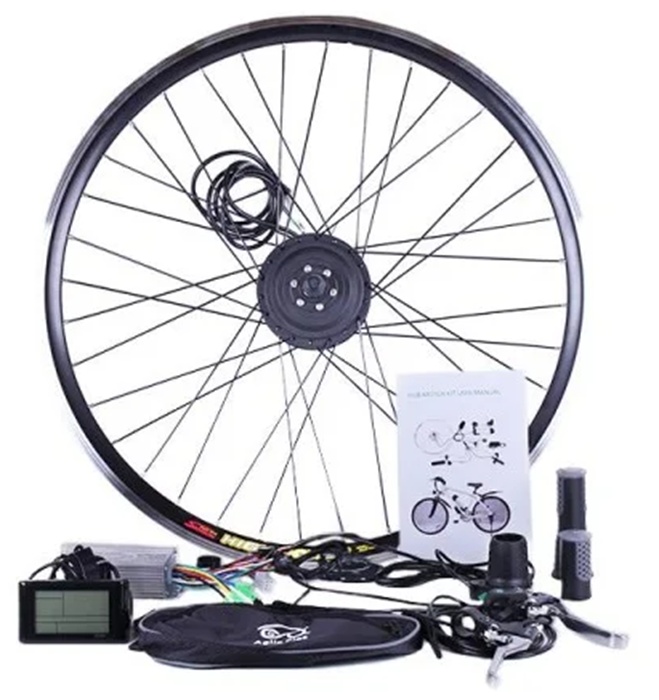 Внимание: набор НЕ комплектуется аккумулятором! Электровелонабор подойдет к установке на любую модель Вашего двухколесного байка. Благодаря балансу мощности и надежности 350w мотора с планетарным редуктором – Вы с легкостью взберетесь к новым горизонтам. Элементы набора готовы к монтажу. Устанавливаются легко и без проблем с посадочными местами и трещотками. Собранное и заспицованное колесо с электродвигателем 36v 350w, ставится на переднюю или заднюю ось велосипеда (в зависимости от комплекта). Крепкий обод с усиленными спицами защищает мотор от деформации, вынослив и стойкий к нагрузкам. Отличный накат и легкость хода вместе с ассистирующим режимом эксплуатации экономят заряд батареи и не превратят «карету в тыкву» на дальней дистанции! Система ассистирования педалям (Pedal Assist System) подходит к любому напряжению цепи и поддерживает движение в гибридном режиме, без участия ручки газа. Частота и подбор оборотов двигателя произойдет автоматически, с вращением педалей. Максимальная нагрузка на аккумуляторную батарею происходит при запуске мотор-колеса. Используйте экономичный режим езды, сохранив от 20% ресурсов АКБ, запуская двигатель с помощью PAS. Мощность 350 ватт даст Вам скорость до 35 км, в зависимости от общей нагрузки и проходимости пути. Включается режим «PAS» управляющим контроллером 36v 18A, гарантирующим плавный пуск электровелосипеда. Управление аккумуляторами и датчиками холла двигателя – его основная задача. Он организует корректную работу колеса и тормозных ручек, управления скоростью и тягой мотора. Новый уровень управления велосипедом - сделает путь комфортным и приятным. Режим имитации крутящего момента, ассистирование педалей, отключение двигателя при торможении и передача информации от дисплея, спидометра – полезные пользовательские функции. Вы будете контролировать ситуацию в дороге на 100% и не останетесь с разряженным аккумулятором в неожиданный момент. Дисплей LCD. Также набор оснащен ручками газа/тормоза, которые управляют функцией приведения в движение или тормоза мотора колеса, показывает индикацию емкости аккумулятора. Компактное зарядное устройство для быстрого и безопасного заряда, сохраняющего срок службы аккумуляторов. А грипсы, в свою очередь, обеспечат надежный захвата руля, смягчения вибрации, уменьшение нагрузки на суставы.