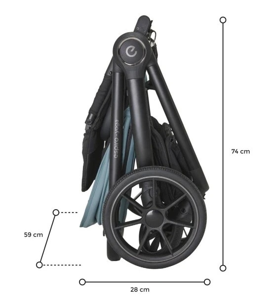 Рама коляски легкая и компактная. Складывается буквально движением одной руки. Рама изготовлена из алюминия. После складывания ее можно хранить в горизонтальном или вертикальном положении, благодаря чему он занимает мало места. Коляску можно сложить вместе с сиденьем в обе стороны. Идеально сбалансированная конструкция рамы оснащена эластичным ремешком с функцией амортизации, благодаря чему ее легко носить с собой.