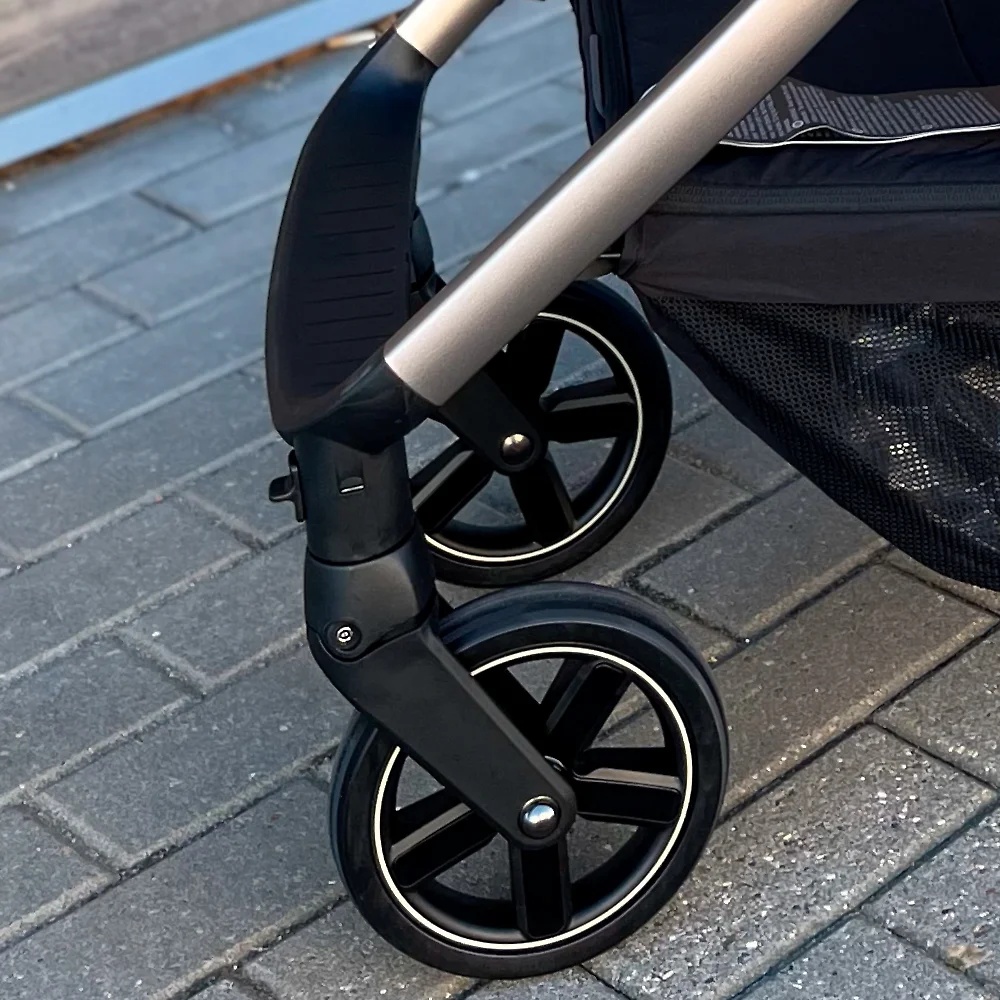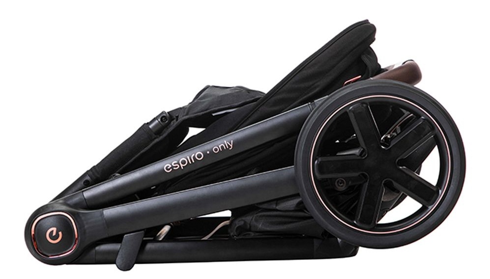Корзина у Espiro Only Way вместительная и закрытая. Все ваши вещи в полной безопасности: не выпадут на кочках и не испачкаются от грязи. Корзина имеет жесткое дно, не провисает и не протирается на бордюрах, на задней части крышка на магнитах. Тормоз расположен у правого заднего колеса, снимается не портя вашу обуви. Ход у коляски приятный и мягкий. Эластичные колеса придают максимальную проходимость, а также дополнительно смягчают тряску от езды по неровностям. При езде по песку или снегу передние поворотные колеса можно зафиксировать в положении прямо, что повышает проходимость коляски. Espiro Only Way довольно компактно складывается вместе с прогулочным блоком. Неважно, установлен он лицом к маме или по ходу движения – вы одинаково легко сложите шасси. В сложенном виде коляска стоит самостоятельно и занимает минимум места, легко помещается в багажник.