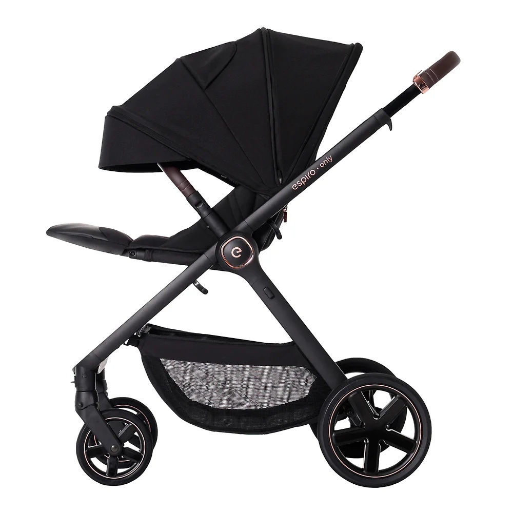 Коляска подходит родителям любого роста, ведь она легко подстроится под вас. Просто нажмите на кнопку по центру ручки и отрегулируйте высоту, как вам удобно. Ручка выполнена из мягкой экокожи и имеет приятный хват. По бокам расположены удобные крючки для вещей. Если вы предпочитаете вешать сумку за наплечный ремень, то такие крючки не дадут ей съехать по раме вниз. Еще одна фишка ручки Espiro Only Way – это возможность ее полностью сложить. Такая функция особенно удобна, когда блок стоит лицом к родителю. Если вы, например, задумали пообедать в кафе, Espiro Only Way может превратиться в стульчик для кормления. Просто опустите ручку вниз к колесам. Придвиньте ребенка максимально близко к обеденному столу. Теперь крохе удобно сидеть рядом с вами, а сама коляска занимает минимум места.