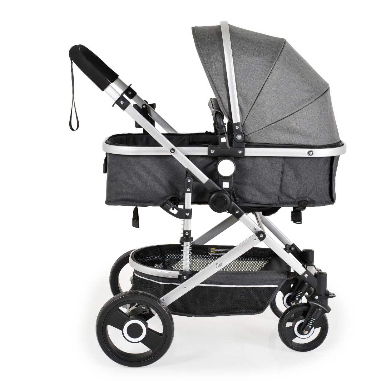 Детская коляска имеет алюминиевую раму и заднюю, переднюю и среднюю подвески.
