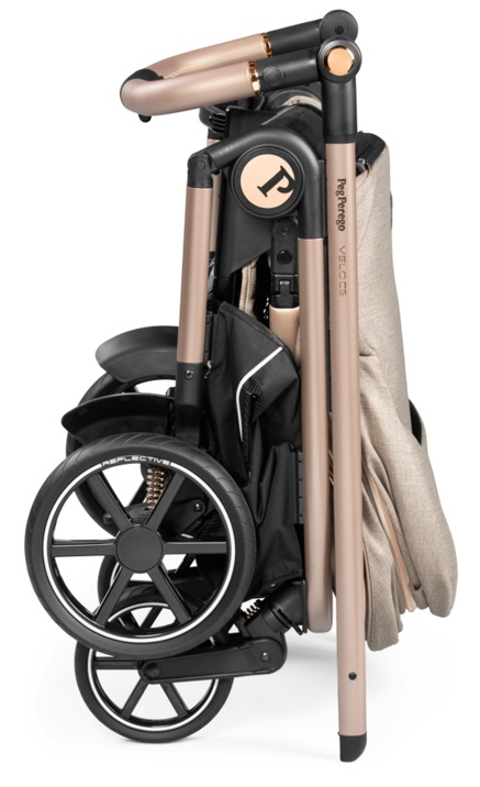 Прогулочная коляска Veloce складывается и раскладывается всего одной рукой с помощью специальной централизованной системы складывания, расположенной на ручке. В сложенном виде занимает очень мало места, и сама стоит без опоры, не пачкая ручку и тканевую обивку.