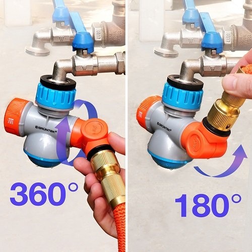 Есть возможность переключить поток воды со шланга на кран не отсоединяя шланг, благодаря специальному регулятору. Мультифункциональный адаптер Gruntek подходит для подсоединения на разъем 1/2" и 3/4".