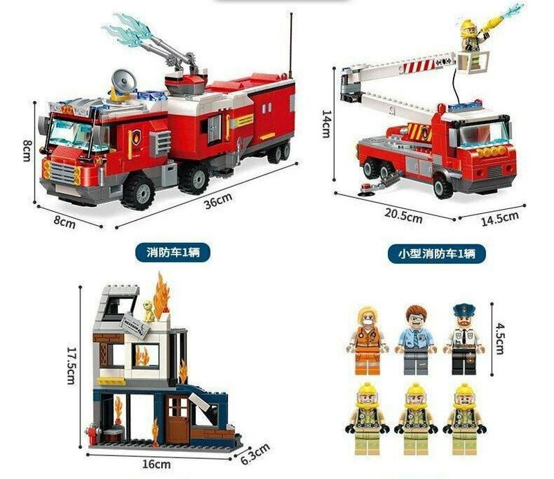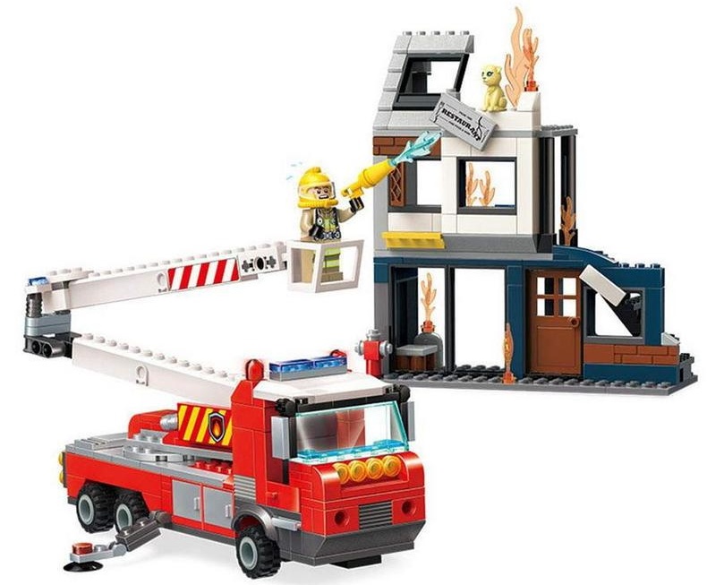 Здание "в огне" 2 Пожарные машины. Так же в наборе 6 фигурок (4 спасателя,
