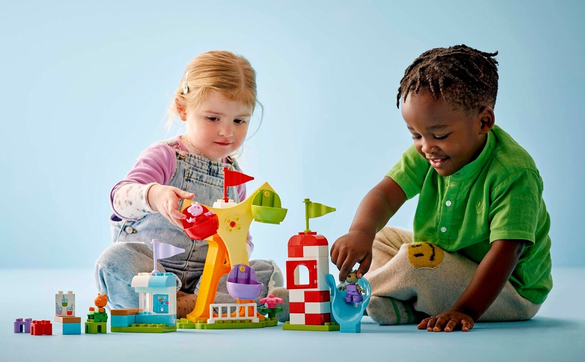 Наполните игровое время динамичным весельем и приключениями с игрушкой для малышей LEGO® DUPLO® Peppa Pig Funfair (10453). Дошкольники в возрасте от 2 лет и старше могут целый день играть в парке развлечений в компании узнаваемых игрушечных персонажей из их любимого сериала. Малышам понравится, когда фигурки Свинки Пеппы, кота Кэнди и пса Дэнни будут вращаться на вращающемся колесе обозрения в этом игровом наборе для дошкольников. Затем они могут поиграть, по очереди катаясь с игрушечной горки.