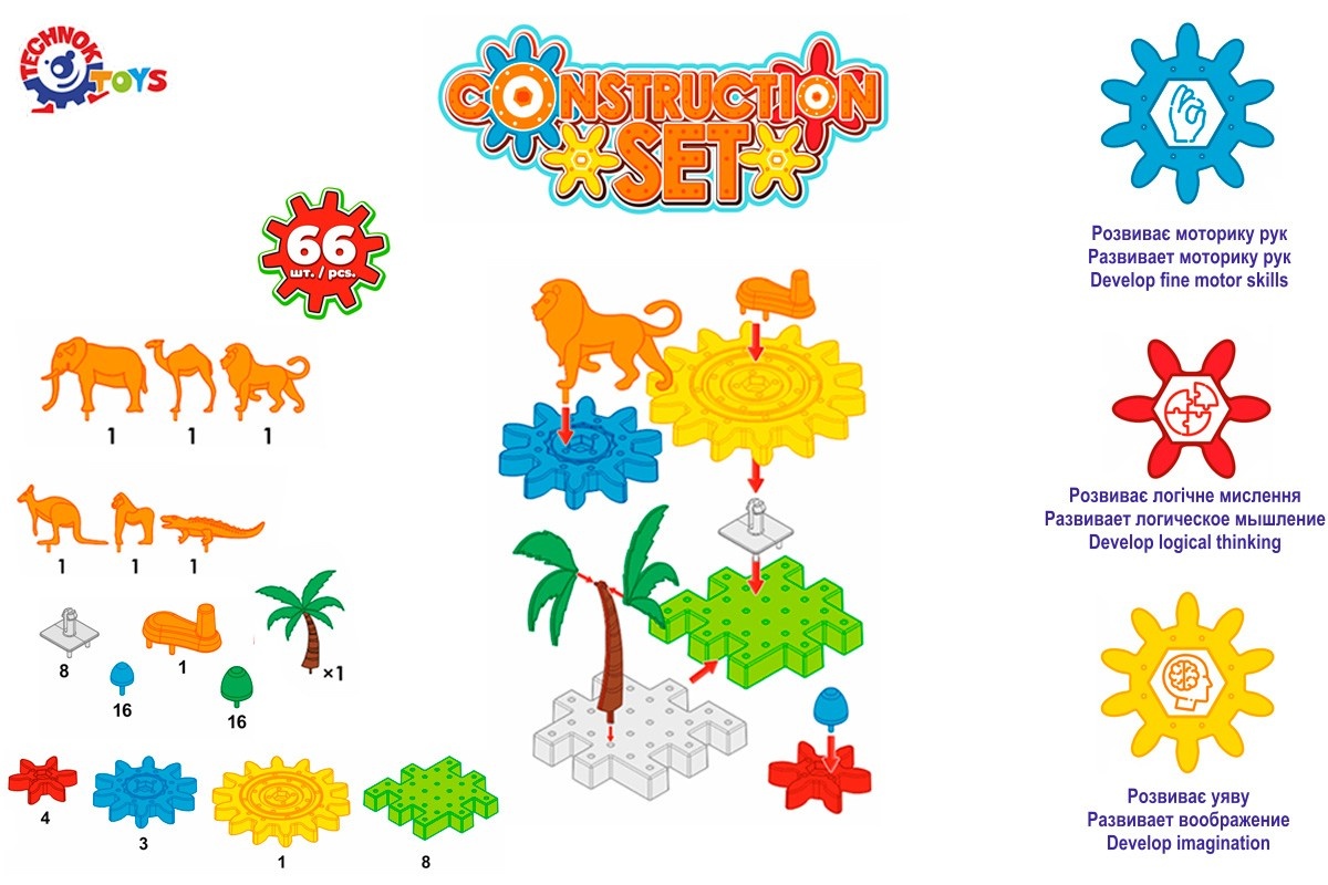 Конструктор состоит из 66 ярких деталей, которые идеально сочетаются между собой. Шестерни, пластины-пазлы, фигурки зверей, пальма и другие оригинальные элементы конструктора вызывают настоящий восторг у детей и взрослых. Все детали конструктора изготовлены из качественной пластмассы, без запаха и вредных составляющих. Продается конструктор в специальном прочном пакете.