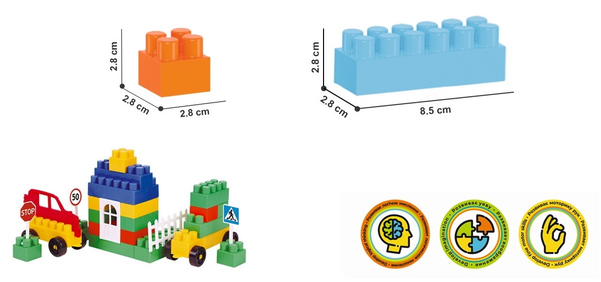 В наборе 380 интересных разнообразных деталей ярких классических цветов. Кирпичики разных размеров, окошки, двери и забор для строительства домиков и замков. Набор дорожных знаков, фигуры машинок и самолета пригодятся для интересных игр с гаражами и паркингами.