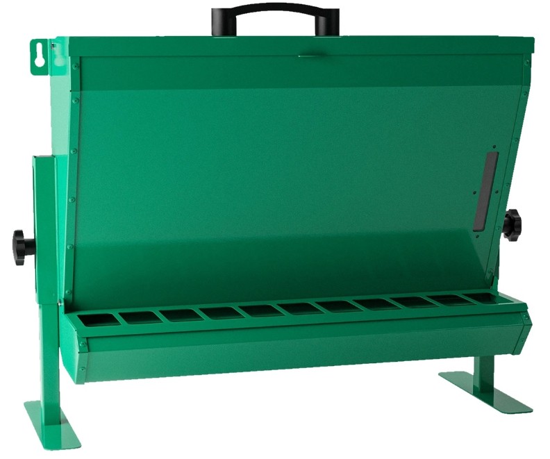 Вмещает до 12 кг корма, сокращая частоту заправок, что идеально подходит для крупных ферм или большого количества птиц.