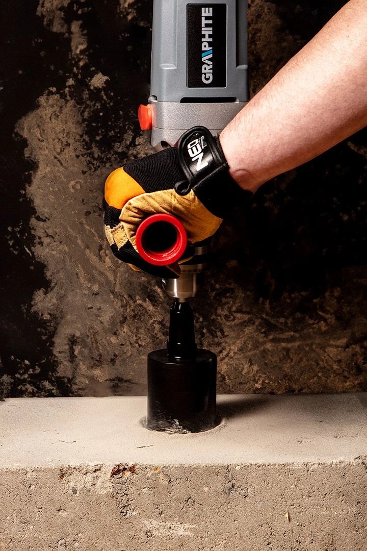 Алмазный кольцевой резец GRAPHITE благодаря лазерной сварке сегментов идеально подходит для тяжелых строительных работ. Высокопрочные алмазные сегменты позволяют эффективно резать отверстия в бетоне, железобетоне, граните, мраморе, камне, кирпиче и т. д.