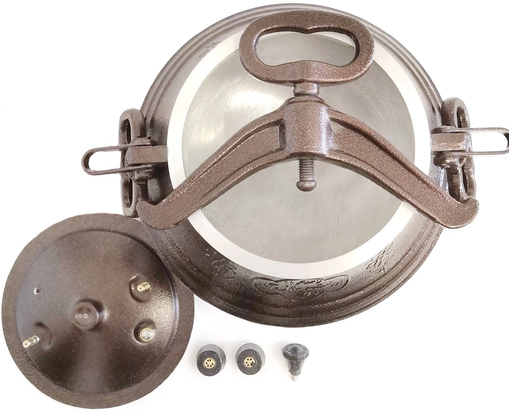 Сверху казан накрывается крышкой, на которой расположены 3 клапана сброса давления, 2 рабочих клапана и 1 аварийный для безопасности. В самой крышке есть паз, куда помещается уплотнительная резиновая прокладка. Чтобы крышка плотно прижималась к корпусу, посуда комплектуется коромыслом. Благодаря такой продуманной конструкции внутри и создается высокое давление при закипании воды. Толстые стенки не дают давлению выйти наружу, а 3 клапана сброса давления не позволяют скапливаться избыточному давлению, делая эту посуду безопасной.