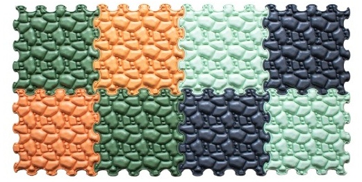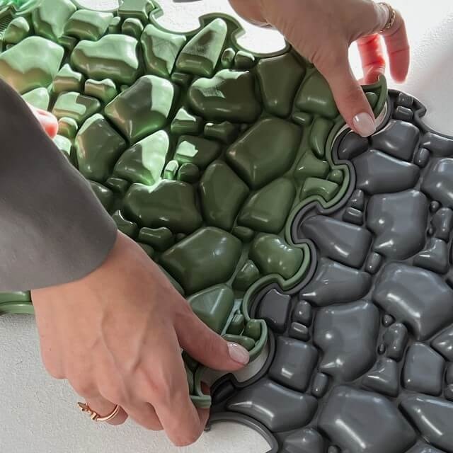 Suportul ortopedic disponibil in magazinul online Empria, include 8 elemente senzoriale de tip puzzle, cu textura moale si forme inspirate din natura (conuri de brad). Fiecare element din pachet prezinta o suprafata rigida acoperita cu 99 de modele de pietre de diferite dimensiuni pentru a ajuta la dezvoltarea abilitatilor senzoriale si motorii.