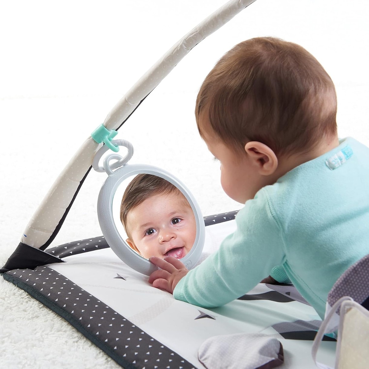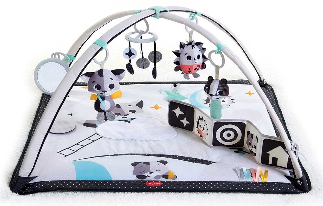 Коврик для общего развития ребенка с первых месяцев жизни, выполнен преимущественно в черно-белой цветовой гамме (наиболее подходящей к особенностям зрительного восприятия малышей) и включает 18 различных игровых активностей. Он рассчитан на 3 этапа взросления малышей: 1) лежим на спинке; 2) лежим на животике; 3) учимся сидеть. Это целый комплекс развивающих игрушек, который способствует гармоничному физическому развитию ребенка, а также помогает тренировать зрительное, тактильное и слуховое восприятие. Съемные дуги регулируются по высоте, позволяя адаптировать их под разные активности.