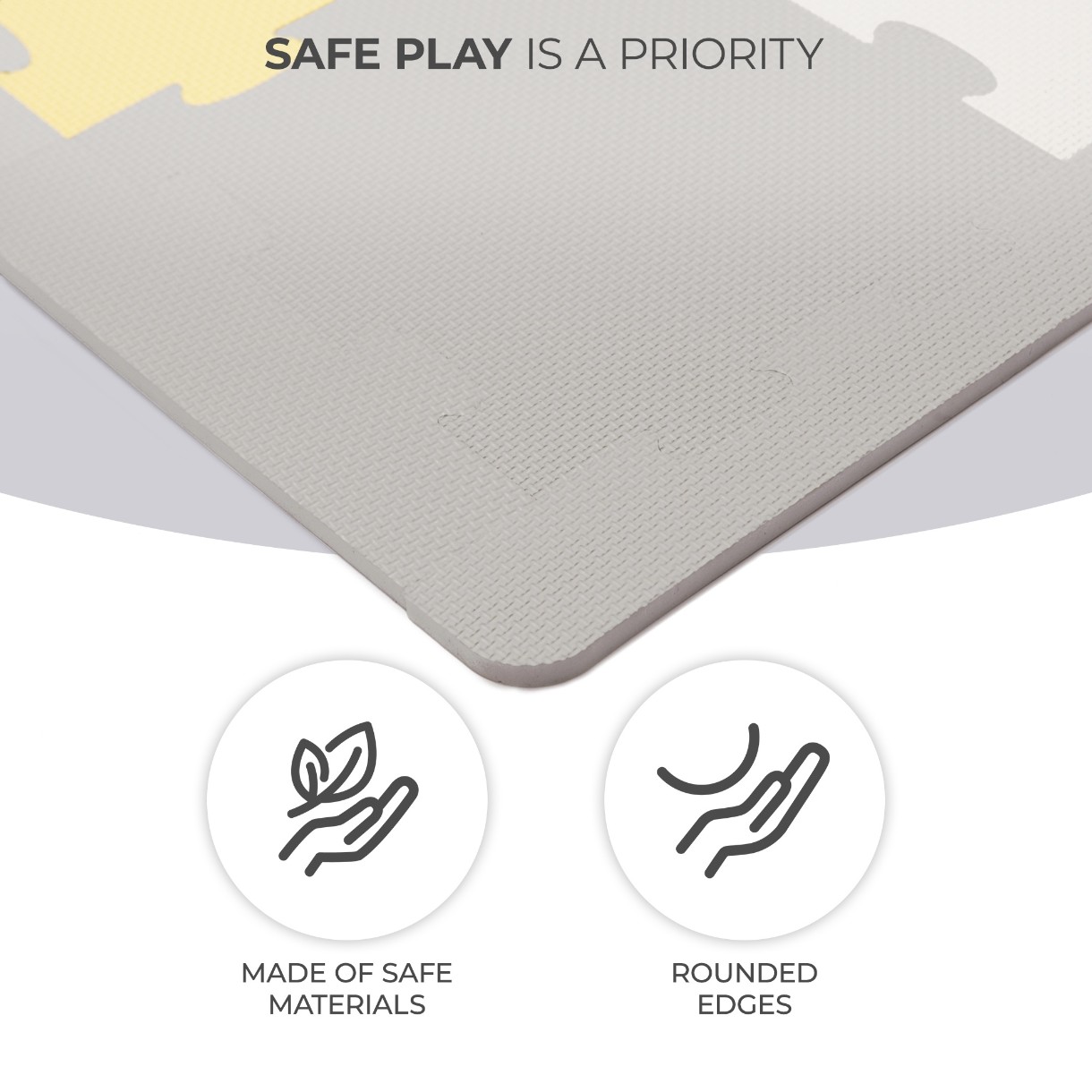 Нейтральные, контрастные цвета головоломки — прекрасный декоративный элемент в комнате. Пазлы сделаны из пены EVA, они безопасны и не содержат вредных веществ. Это подтверждается испытаниями, проведенными независимой лабораторией INTERTEK. Кроме того, их легко содержать в чистоте. В комплект входит сумка для хранения пазлов.