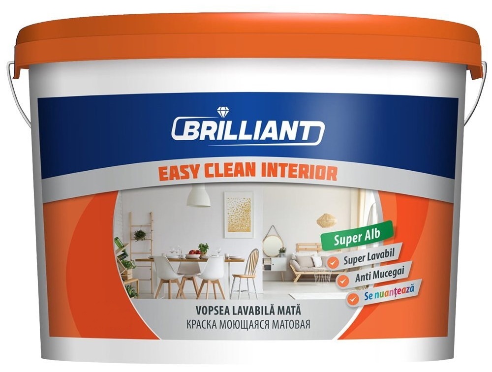 Краска моющаяся матовая Brilliant Easy Clean Interior — дисперсионная краска, кремовой консистенции, используемая для покраски интерьеров стойких к мытью. На вид полувязкая, однородная жидкость, белого цвета. Краска безопасна в использовании: легко наносится; применяется для покраски всех типов оснований на минеральной основе: обычные известково-цементные штукатурки, гипсовые шпатлевки, а также кладки из кирпича, газобетона, азбест, гипсовые плиты, гипсокартон, бетон, стойкие окрашенные поверхности; доступна для компьютерной колеровки используя исключительно рецепты и пигменты BRILLIANT COLOR.