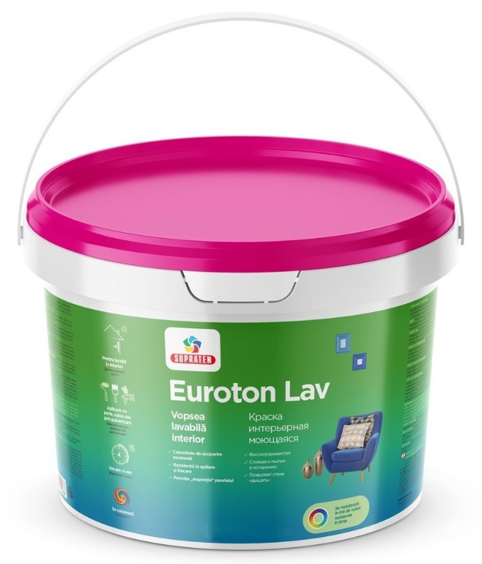 EUROTON LAV — готовая к применению матовая моющаяся краска для стен и потолков в сухих помещениях и с повышенной влажностью. Содержит акрилатную водоэмульсию с пигментами, мелом, каолином и аддитивами.