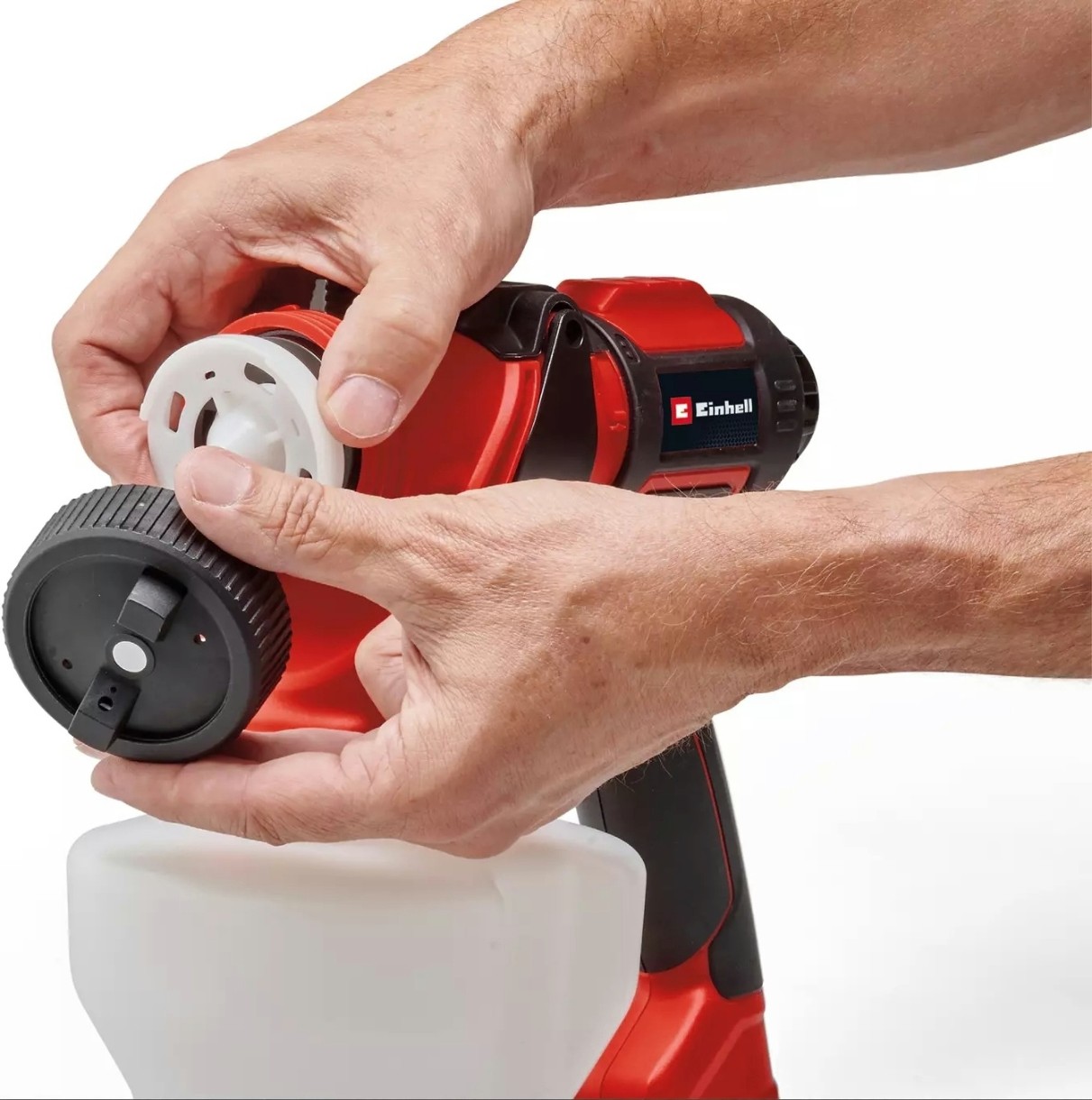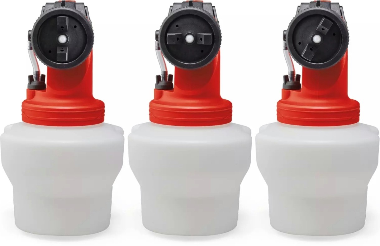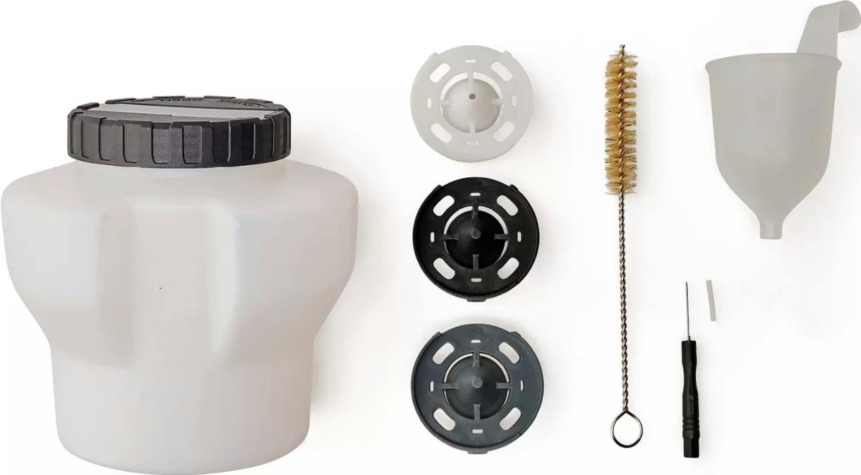 Аккумуляторный краскораспылитель Einhell поставляется с практичными аксессуарами. В комплект поставки входят 3 сопла (3,0 мм, 2,5 мм, 1,5 мм) для различной вязкости краски, глазури и цвета, контейнер для краски (1200 мл) с мерной шкалой и крышкой, а также контейнер для тестирования вязкости. Для оптимальной очистки краскораспылителя в комплект поставки также входят щетка для чистки и игла для чистки.