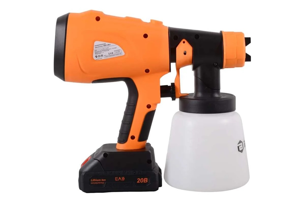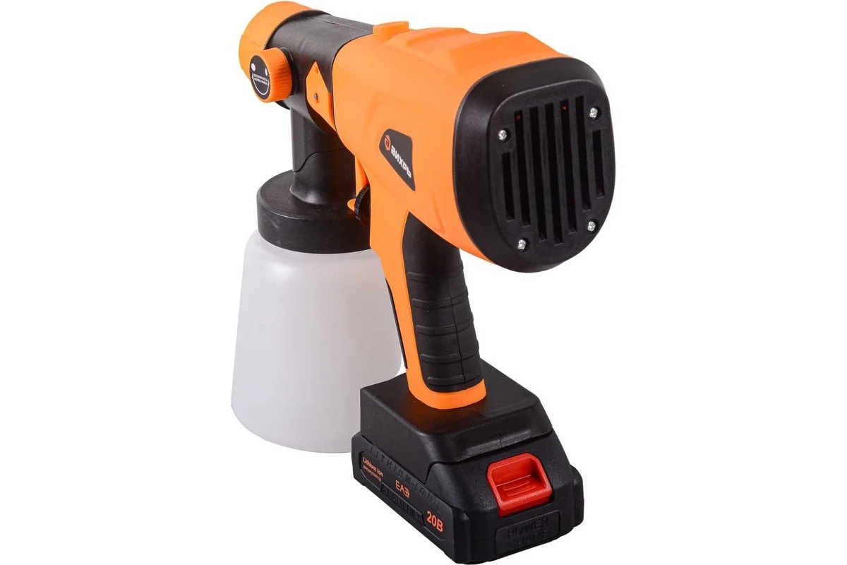 Краскопульт аккумуляторный (краскораспылитель) предназначен для нанесения красок, лаков и других растворимых материалов соответствующей вязкости на различные поверхности. Технология HVLP, реализованная в краскораспылителе, обеспечивает высокую производительность при низком давлении. Подходит для бытового использования в помещениях и на открытом воздухе при плюсовых температурах и влажности не выше 80%. Ход курка распылителя регулируется ограничительным винтом, при этом нормируется подача краски.