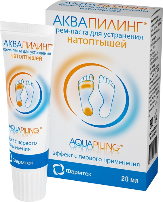 АКВАПИЛИНГ крем-паста от натоптышей 20 мл. Позволяет размягчать даже самые твердые натоптыши. На основе натурального компонента. Эффект с первого применения. Крем-паста АКВАПИЛИНГ специально разработана для устранения натоптышей. Карбамид (мочевина) в концентрации 40% при соблюдении рекомендаций описанных в разделе. «Способ применения» позволяет размягчать даже самые твердые натоптыши. Кратность применения зависит от толщины и плотности натоптышей.