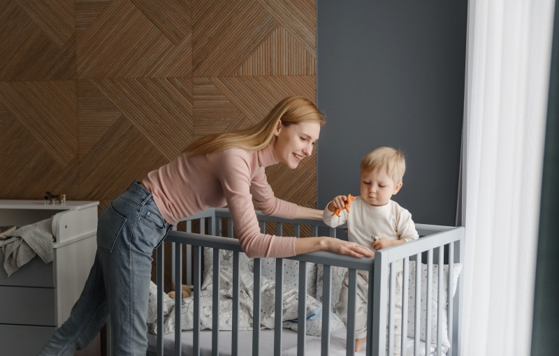 Кроватка имеет маятниковый механизм поперечного качания с фиксатором, а также возможность опускания бортика. Высоту спального места можно регулировать на двух уровнях. Все детали имеют безопасные округлые формы, а также бортики с накладками-грызунками.