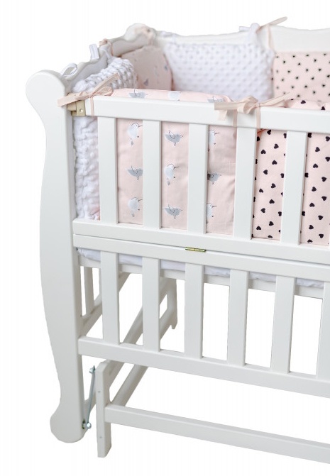 Кроватка укомплектована съемной боковой планкой, которая служит защитным барьером для ребенка и одновременно при его снятии, облегчает Вам доступ к младенцу. Фиксируется боковина с помощью пластмассовых фиксаторов.