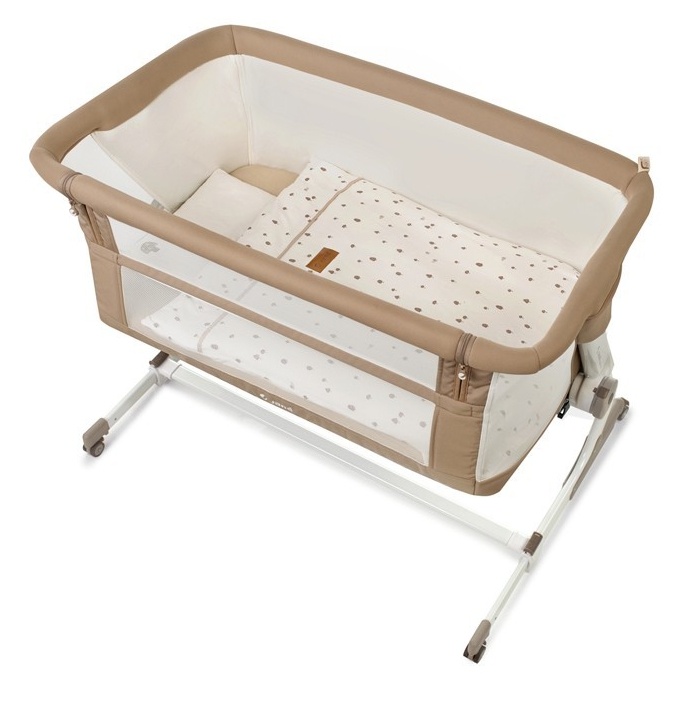 Это удобное и безопасное решение. Ребенок ограничен с трех сторон и имеет собственное спальное место, но при этом находится вблизи к своим родителям. Высоту детской кроватки можно свободно регулировать благодаря телескопическим ножкам, что позволяет выбрать одно из шести положений — от 68 до 79 см.